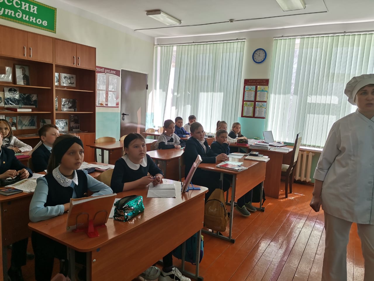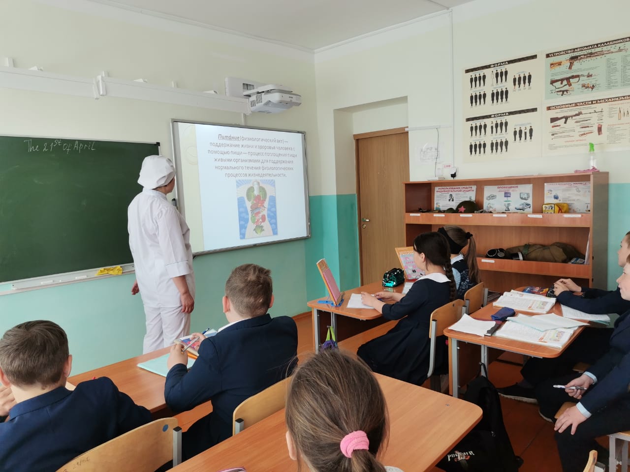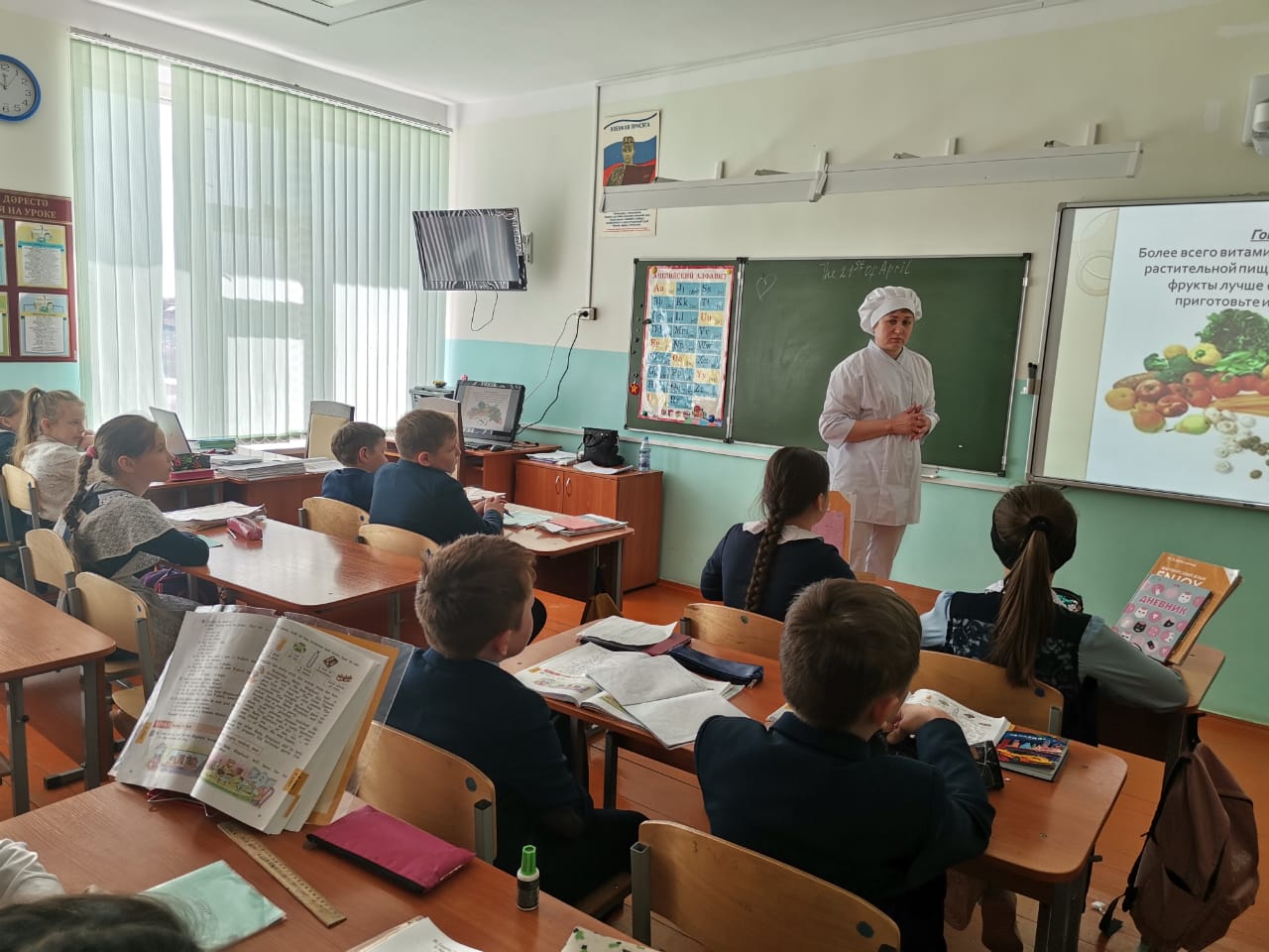 В рамках недели здорового питания 21 апреля 2021 года перед учащимися выступила повар школы. Она рассказала о здоровом питание, о пользе продуктов, о своей работе и т.д.