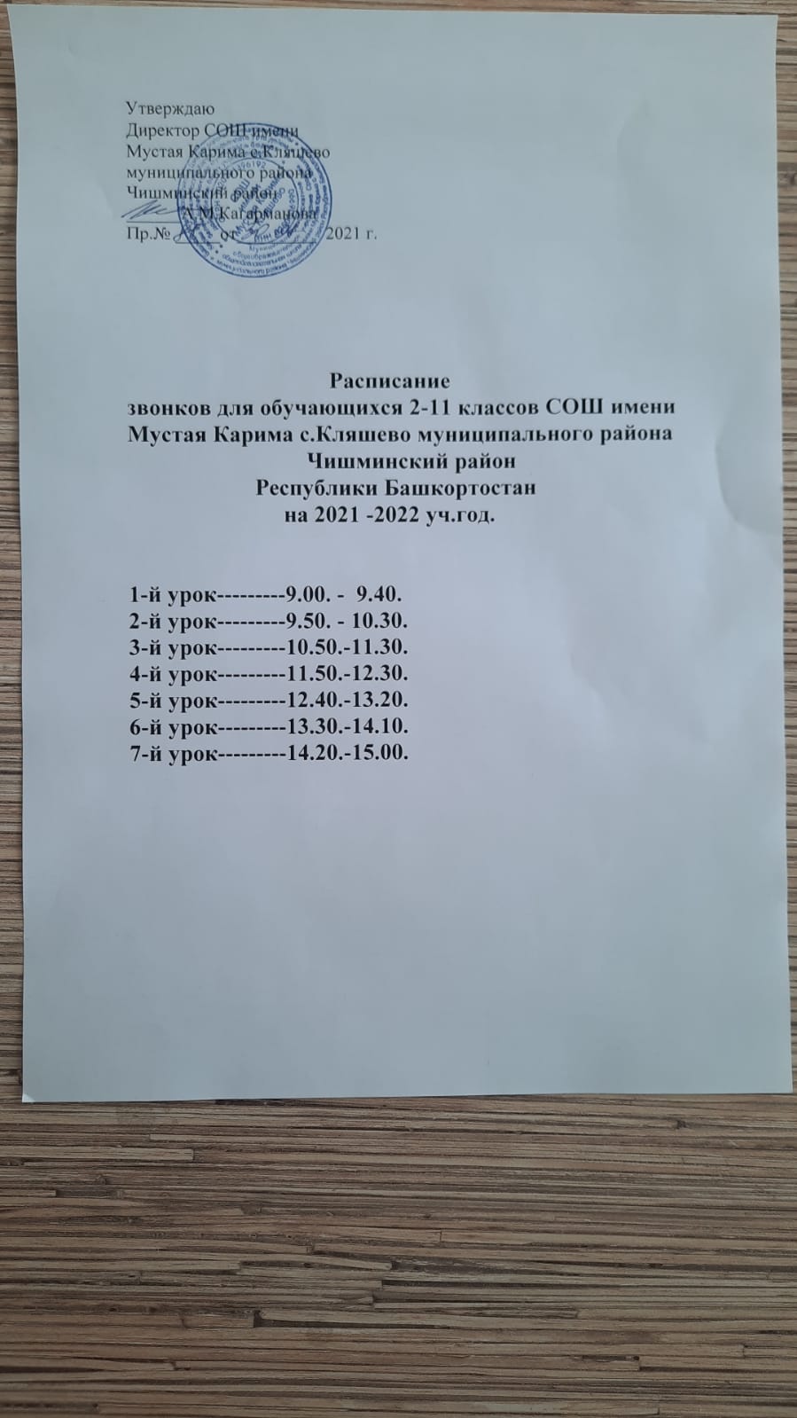 Расписание звонков на 2021-2022 уч.год МБОУ СОШ имени Мустая Карима с.Кляшево муниципального района Чишминский район РБ