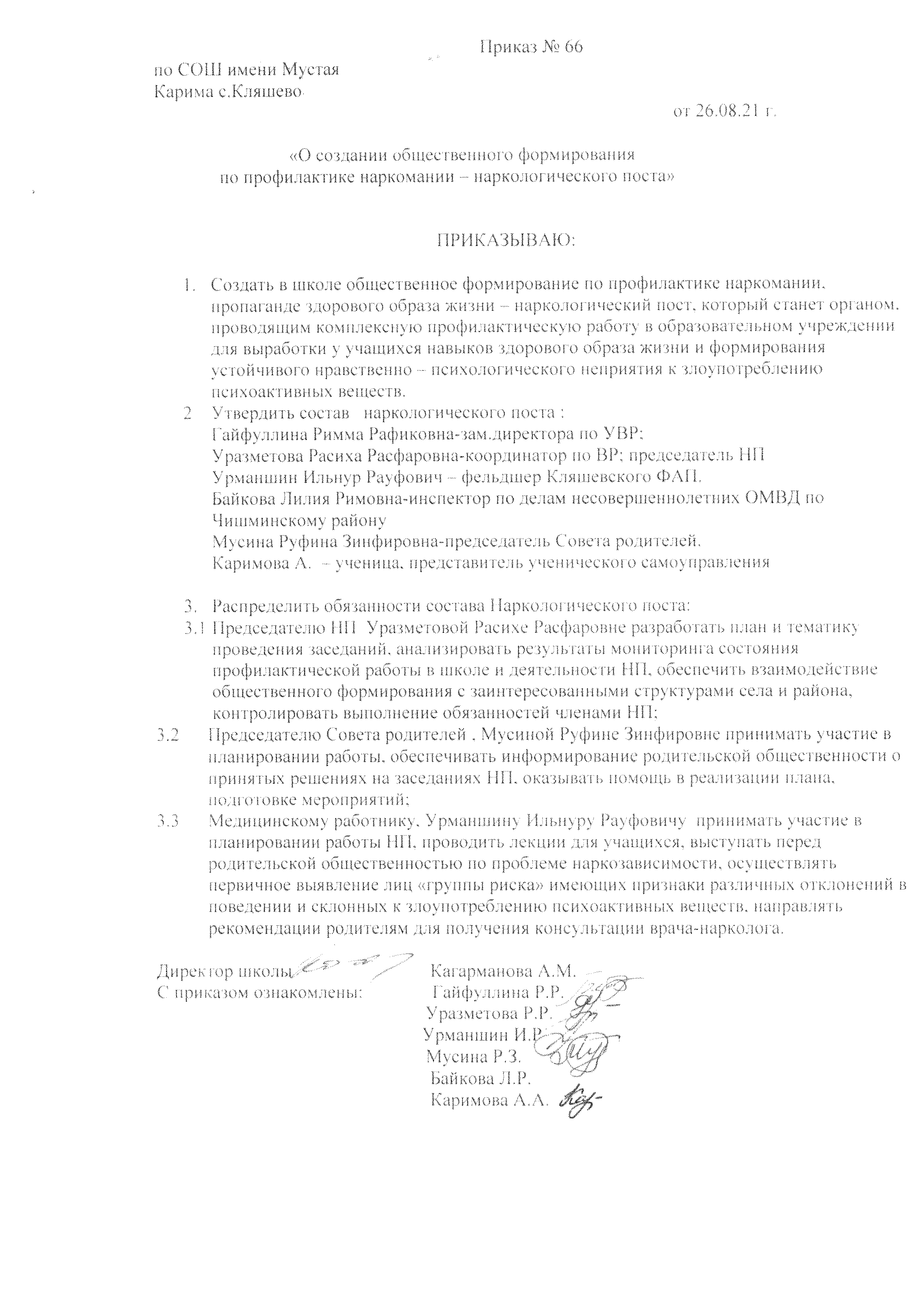 Приказ №66 "О создании общественного формирования по профилактике наркомании - наркологического поста" от 26.08.2021 г