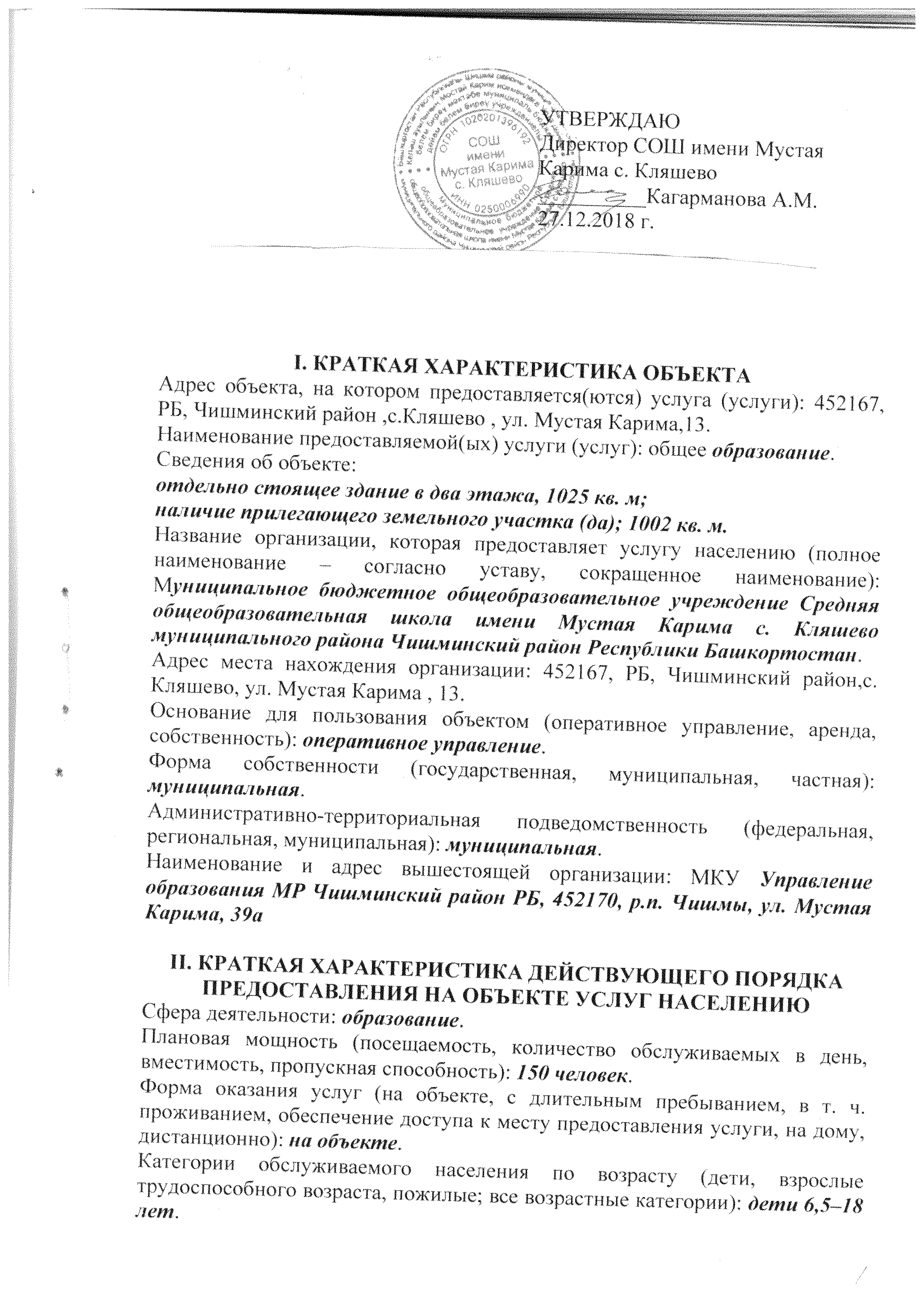 Характеристика объекта (МБОУ СОШ имени Мустая Карима с.Кляшево)